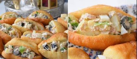 6. Préparez la garniture : ouvrez les morceaux de pâte frits en deux et garnissez-les avec du thon émietté, des rondelles de pommes de terre, des rondelles d’œufs durs, des câpres, des olives noires et de la salade verte.