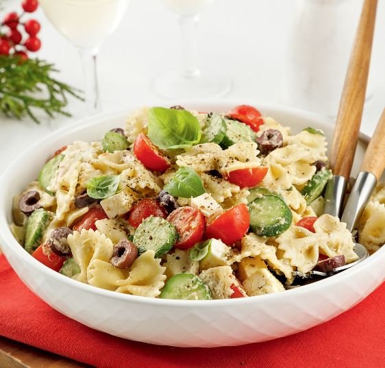 - Versez la vinaigrette sur la salade de pâtes et mélangez délicatement pour bien enrober tous les ingrédients.